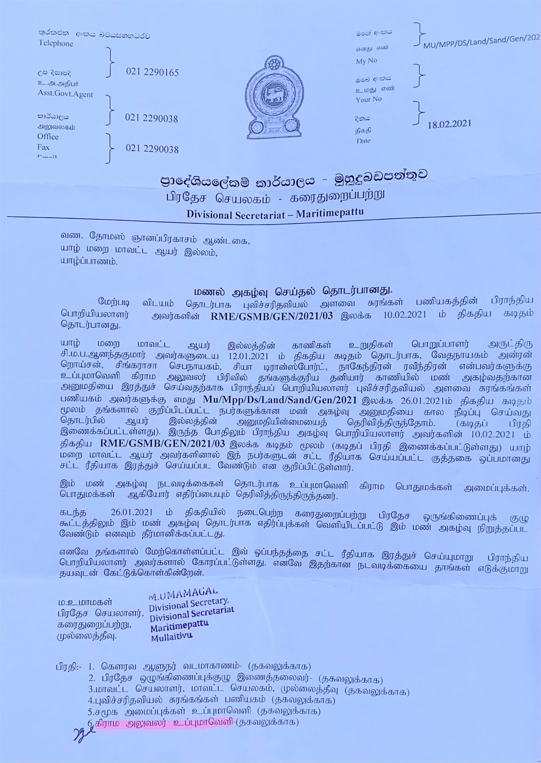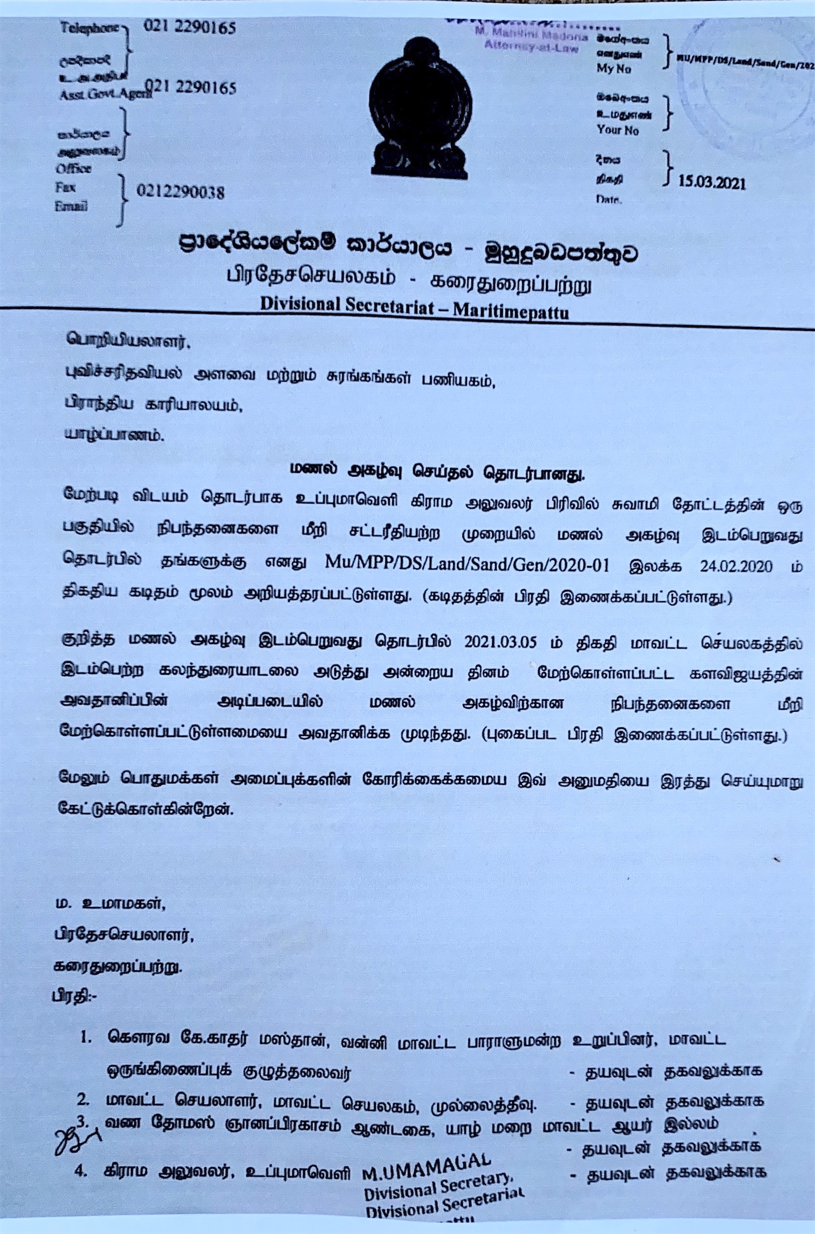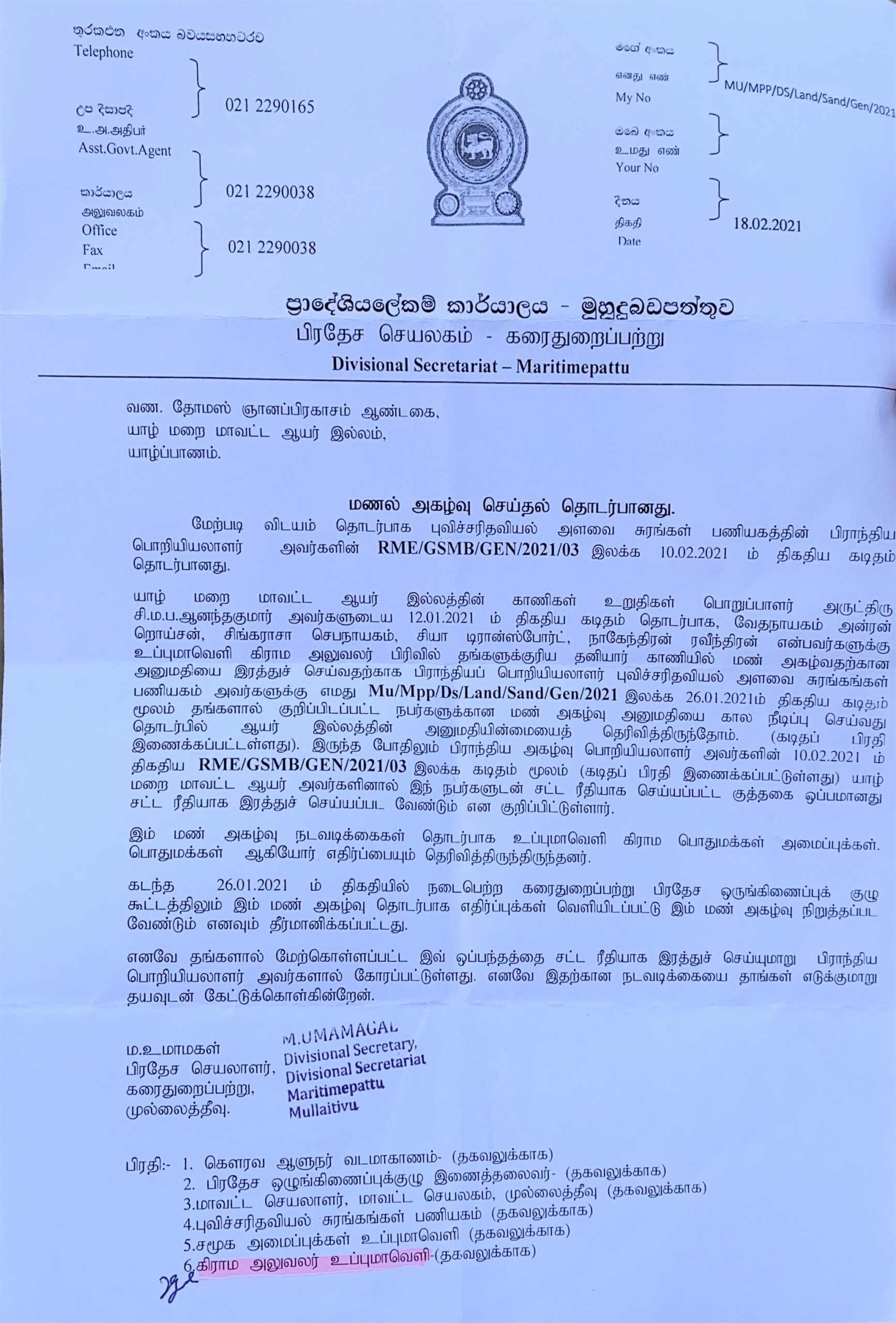 பிரதேச செயலர், மாவட்டச் செயலருக்கு தகவல் வழங்கிய நிலையில் மாவட்டச் செயலர் ,பிரதேச செயலர் ஆகியோர் புவிசரிதவியல் திணைக்களத்துக்கு மண்ணகழ்வு நடவடிக்கையை நிறுத்துமாறு அனுமதியை இரத்து செய்யுமாறும் 15.03.2021 அன்று கடிதம் மூலம் அறிவித்துள்ளார்.பிரதேச செயலரால் எழுதப்பட்ட கடிதத்தின் பிரதிகள் மாவட்ட ஒருங்கிணைப்புக்குழுவின் தலைவர் நாடாளுமன்ற உறுப்பினர் மஸ்தான் உட்பட்டவர்களுக்கு கூட அனுப்பப்பட்டிருக்கின்றன.
