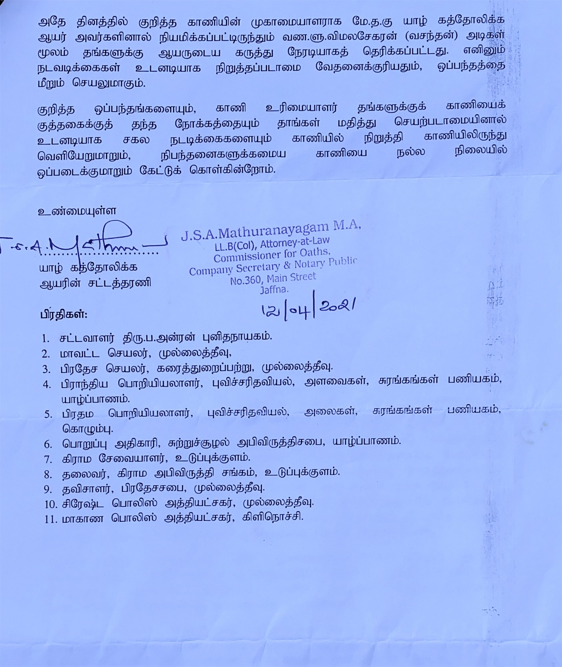 குறித்த வழக்கில் ஆயர் இல்லத்துக்கும் ஒப்பந்ததாரருக்கும் சாட்சியாளராக கையொப்பமிட்டிருந்த சிரேஸ்ட சட்டத்தரணி ஒப்பந்ததாரரின் பிரதான சட்டவாளராக நீதிமன்றில் முன்னிலையாகியிருந்தார் .இந்த நிலையில் பயணத்தடை விதிக்கப்பட்டுள்ள நிலையில் கடந்த சிலநாட்களாக ஆயர் இல்லத்தின் உத்தரவை மீறி காணியைவிட்டு வெளியேறுமாறு சட்டதரணியூடாக அறிவித்த பின்னரும் அந்தக் காணியிலிருந்து மணல் வியாபாரியால் மணல் அள்ளிச் செல்லப்பட்டுவருகின்றது.