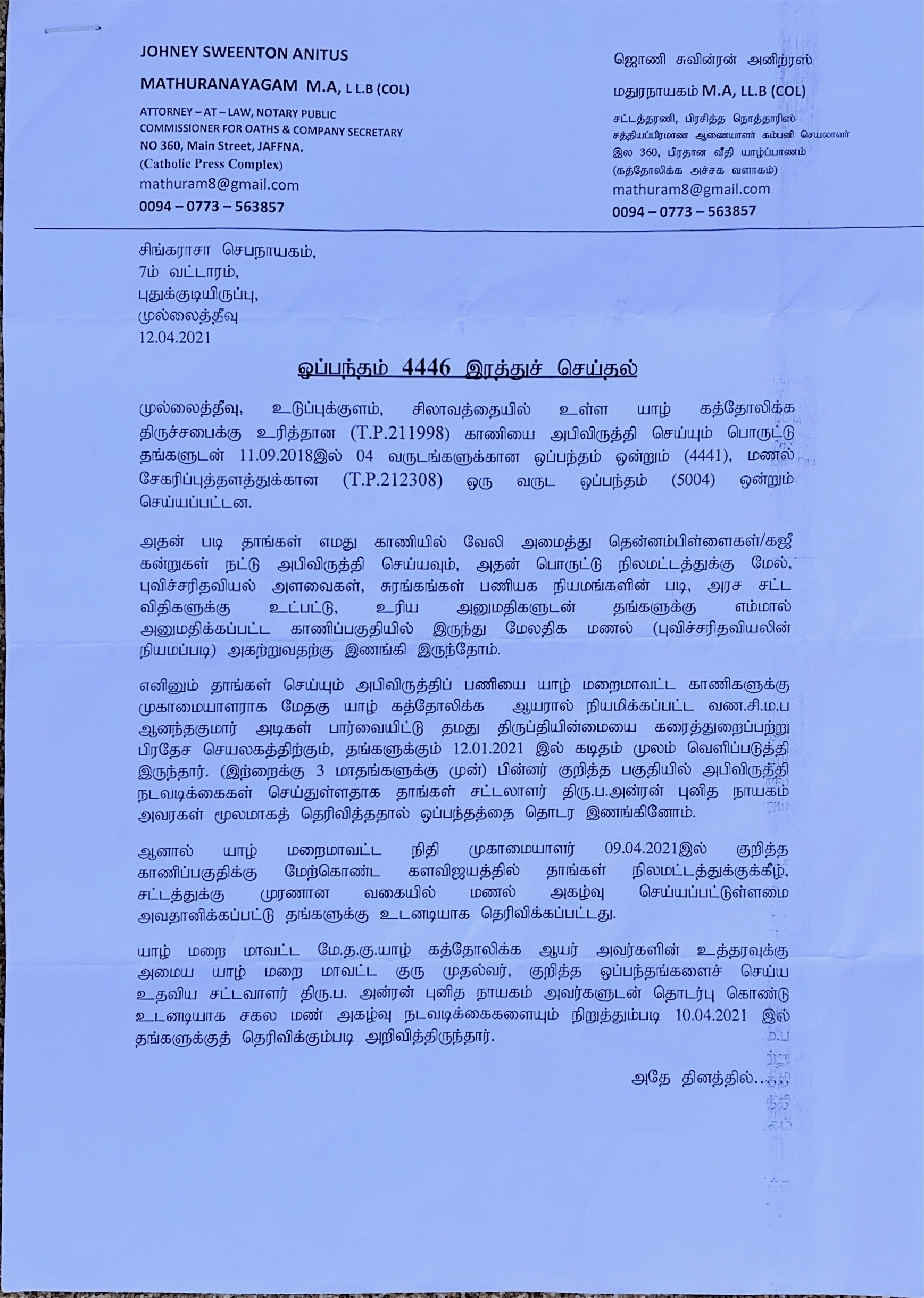 அதன் பின்னர் நிலைமையின் தீவிரத்தை உணர்ந்த ஆயர் இல்லம் பிரதேச செயலருக்கும், புவிச்சரிதவியல் அளவைகள், சுரங்கங்கள் பணியகத்திற்கும் மணல் அகழப்படும் நடவடிக்கையை உடனடியாக நிறுத்துமாறும் தாம் மேற்கொண்ட ஒப்பந்தத்தை முடிவுறுத்திக்கொள்வதாகவும் ஆயர் இல்லத்தின் சட்ட தரணி மதுரநாயகத்தின் ஊடக ஒப்பந்தத்தை முடிவுறுத்தும் கடிதம் அனுப்பியும் நேரிலும் சந்தித்து விளக்கமளித்திருக்கிறது.