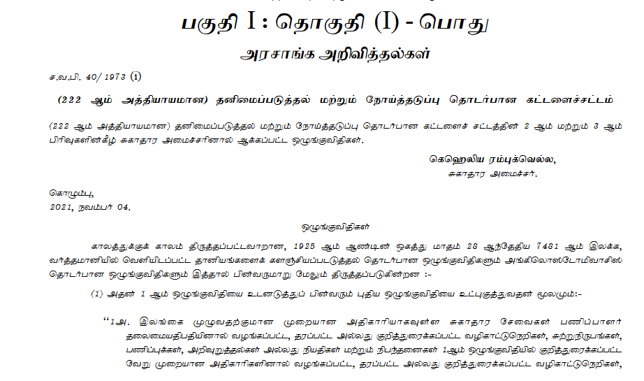 ஒன்றுகூடல்கள், செயற்பாடுகள், நிகழ்வுகள் அல்லது அதுபோன்ற கூட்டங்கள் நடைபெறும் இடங்களுக்கு உரிய அதிகாரிகளின் முன் அனுமதியைப் பெறுவதை கட்டாயமாக்கும் வகையில் தனிமைப்படுத்தல் கட்டளைச் சட்டத்தில் திருத்தம் செய்து சுகாதார அமைச்சர் கெஹலிய ரம்புக்வெல்லவினால் வர்த்தமானி அறிவித்தல் வெளியிடப்பட்டுள்ளது.