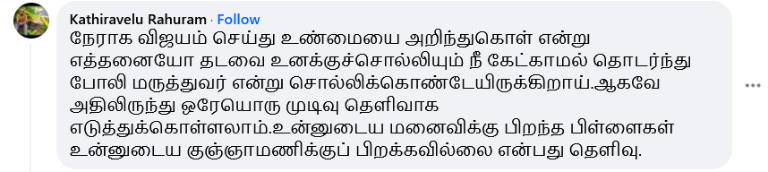 வைத்தியரின் இந்த பேஸ்புக் பதிவின் கீழ், போலி வைத்தியர் என குறிப்பிடப்பட்ட ரகுராம் நாகரிகமற்ற முறையில் பதிவிட்டுள்ளார்.