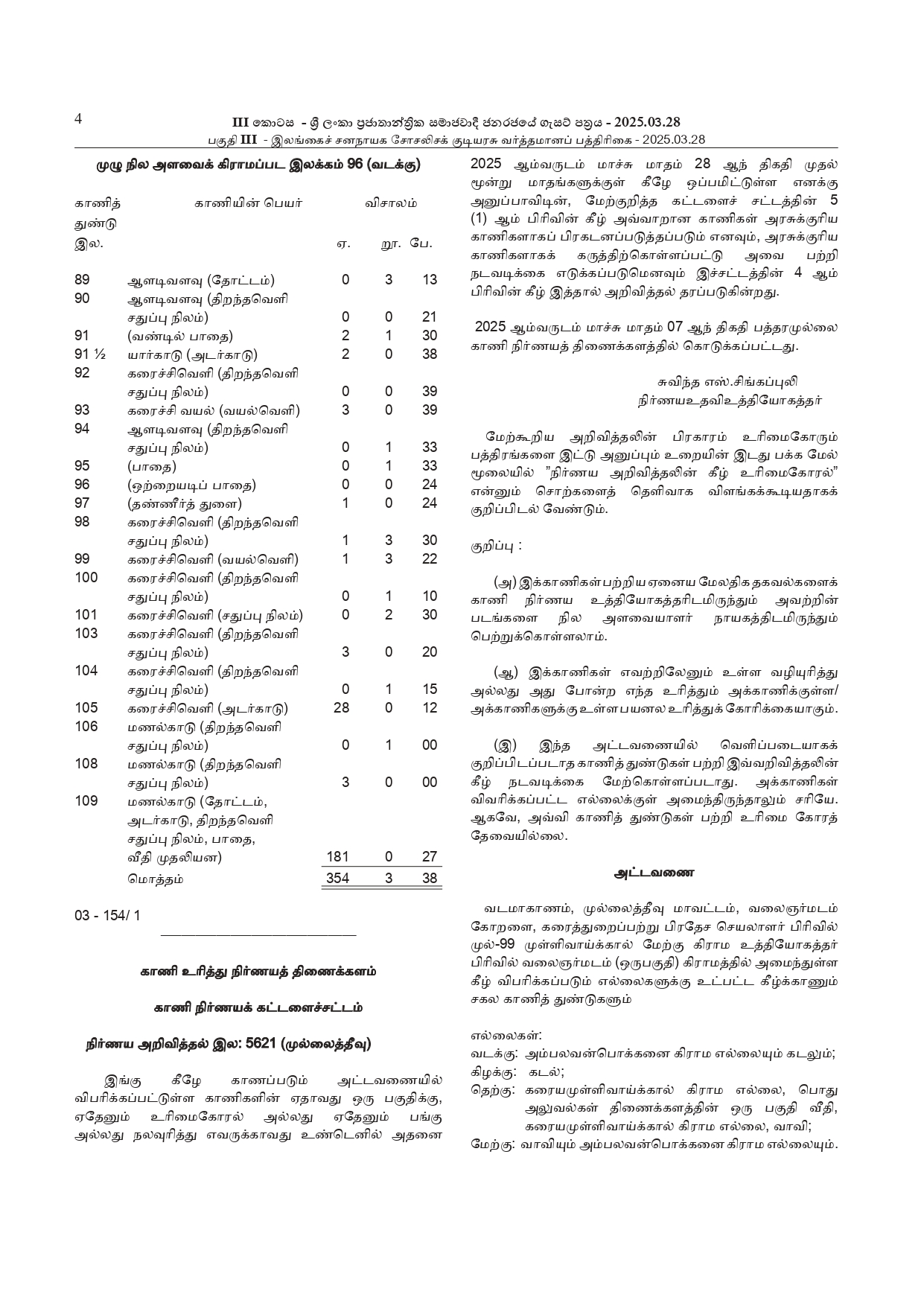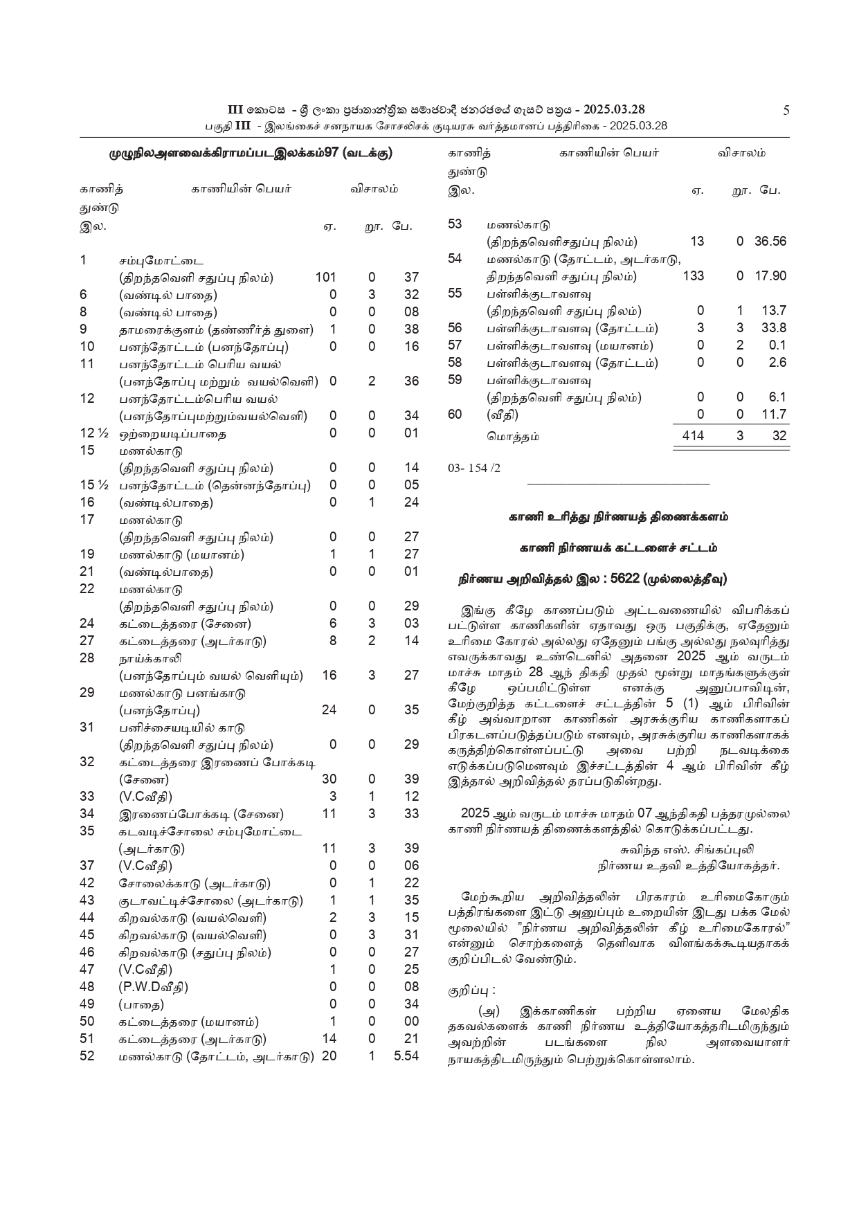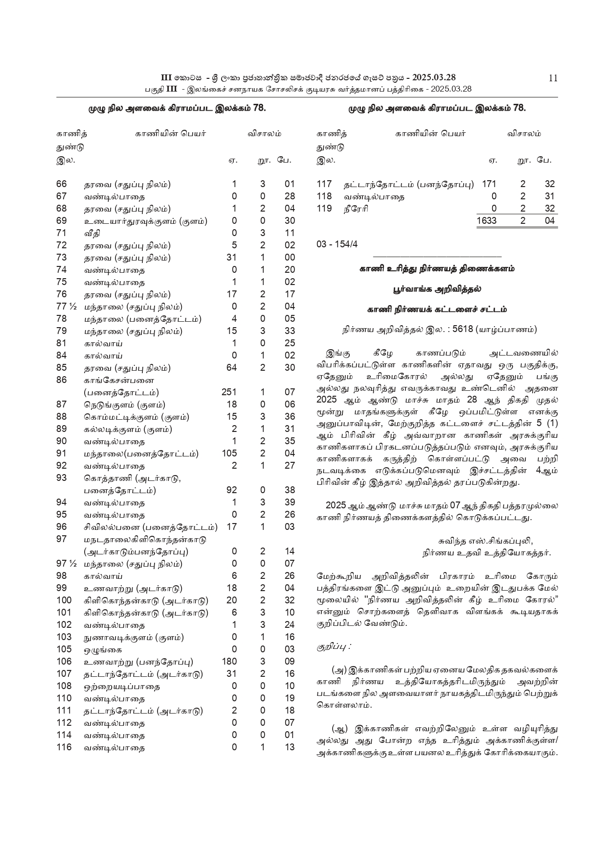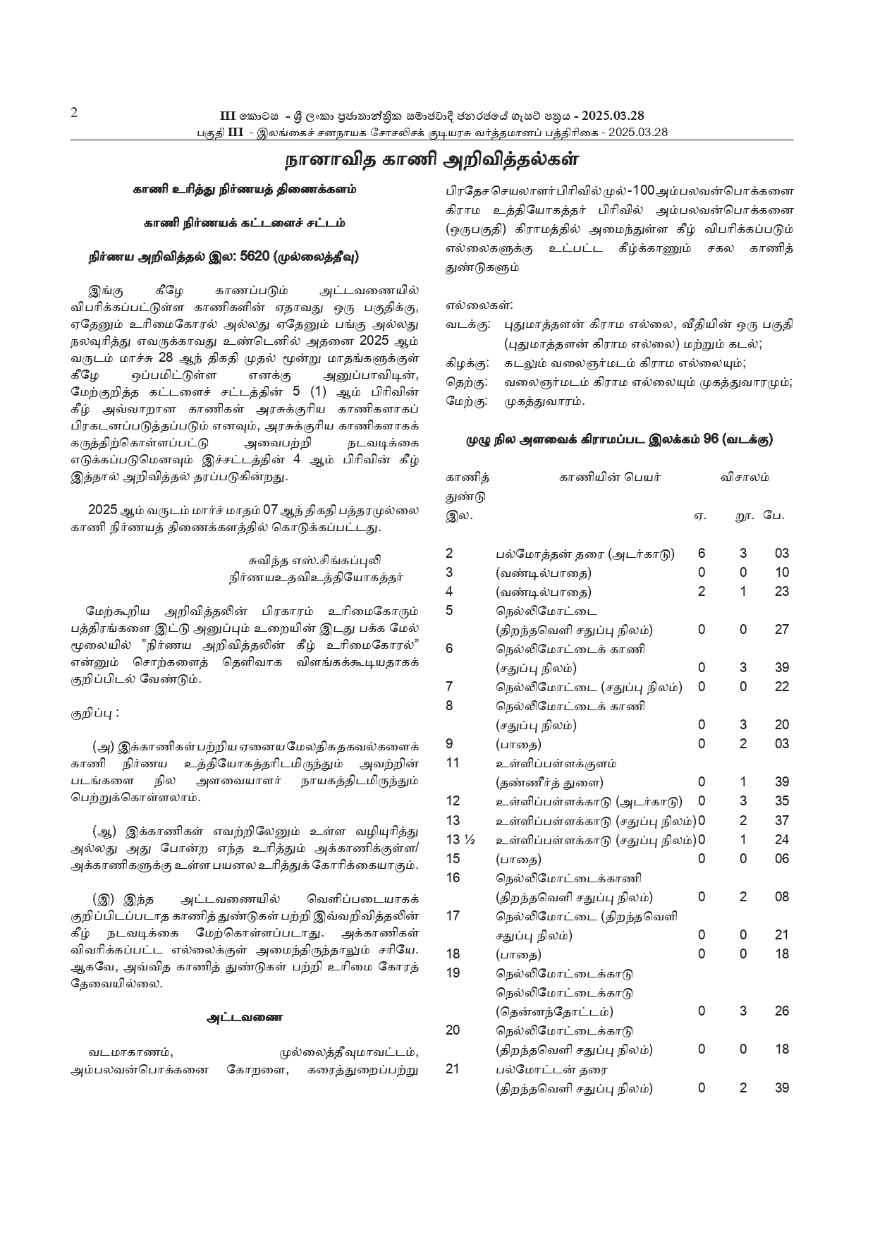 யாழ்ப்பாணம், கிளிநொச்சி, முல்லைத்தீவில் மொத்தமாக 5,940 ஏக்கர் காணிகள் 3 மாதங்களுக்குள் ஒருவரும் உரிமை கோராவிட்டால் அரச காணிகளாக பிரகடனப்படுத்தப்படும் என்று 28.03.2025 திகதியிட்ட 2430 இலக்கமிட்ட வர்த்தமானியில் காணி நிர்ணய கட்டளைச் சட்டத்தின் 4ஆம் பிரிவின் கீழ் பிரசுரமாகியுள்ளது.