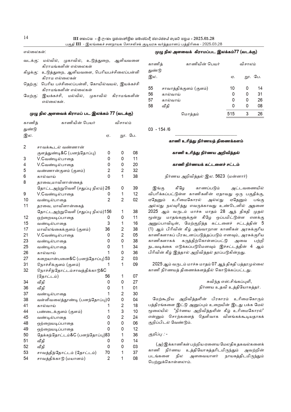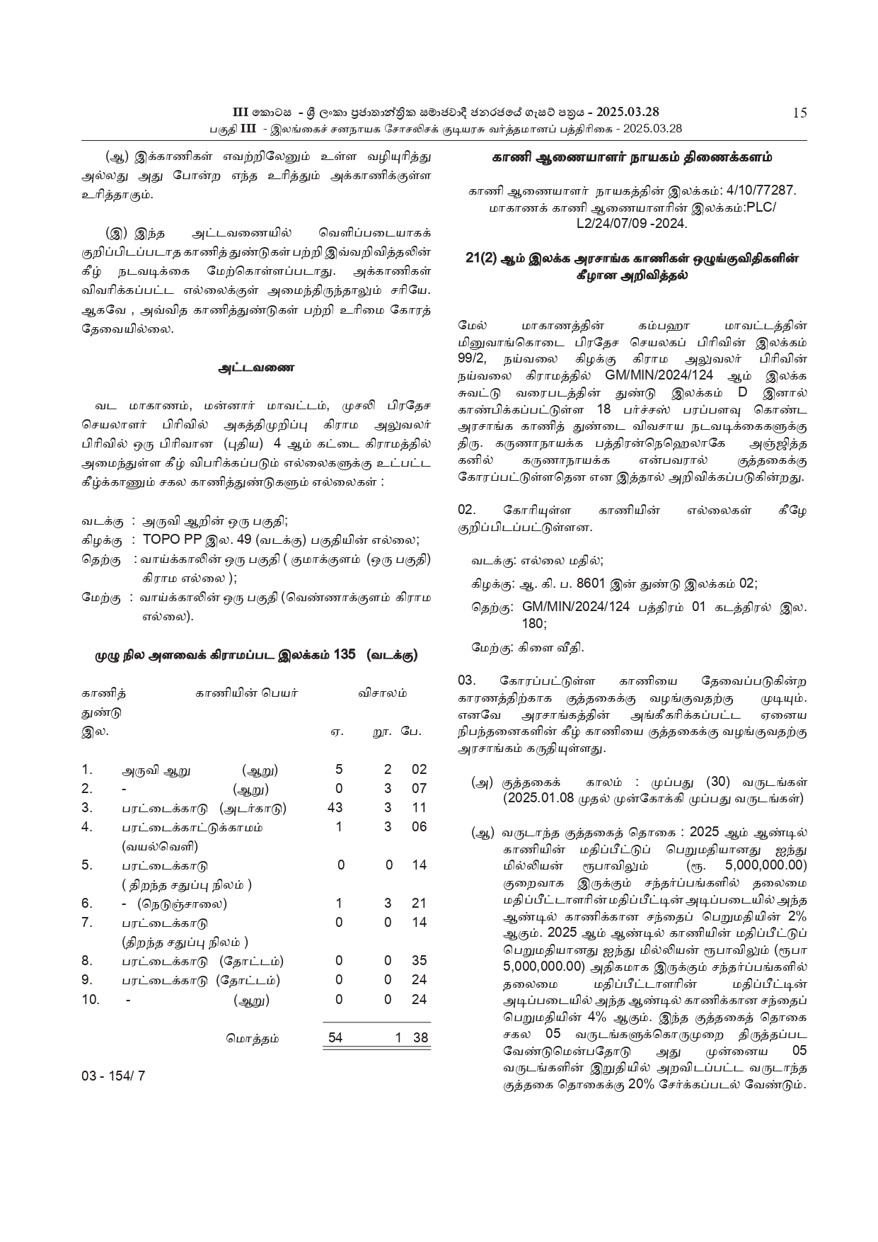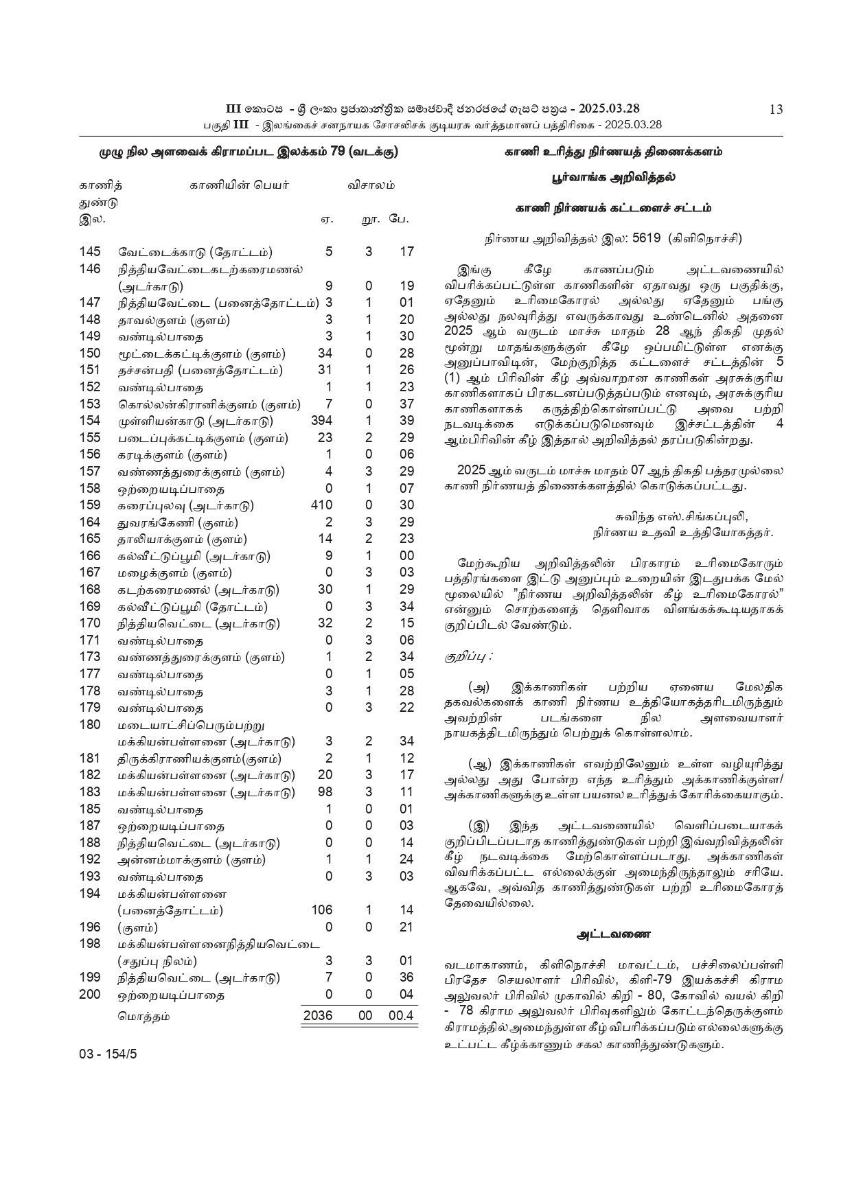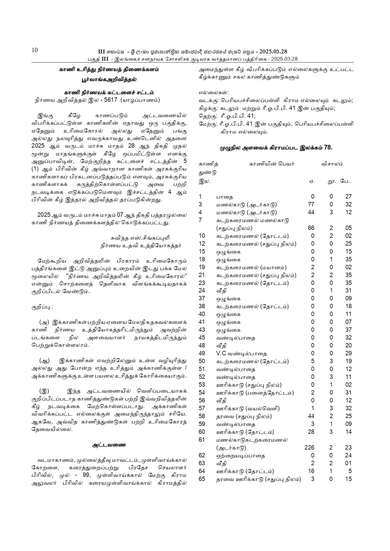 யாழ்ப்பாணம், கிளிநொச்சி, முல்லைத்தீவில் மொத்தமாக 5,940 ஏக்கர் காணிகள் 3 மாதங்களுக்குள் ஒருவரும் உரிமை கோராவிட்டால் அரச காணிகளாக பிரகடனப்படுத்தப்படும் என்று 28.03.2025 திகதியிட்ட 2430 இலக்கமிட்ட வர்த்தமானியில் காணி நிர்ணய கட்டளைச் சட்டத்தின் 4ஆம் பிரிவின் கீழ் பிரசுரமாகியுள்ளது.