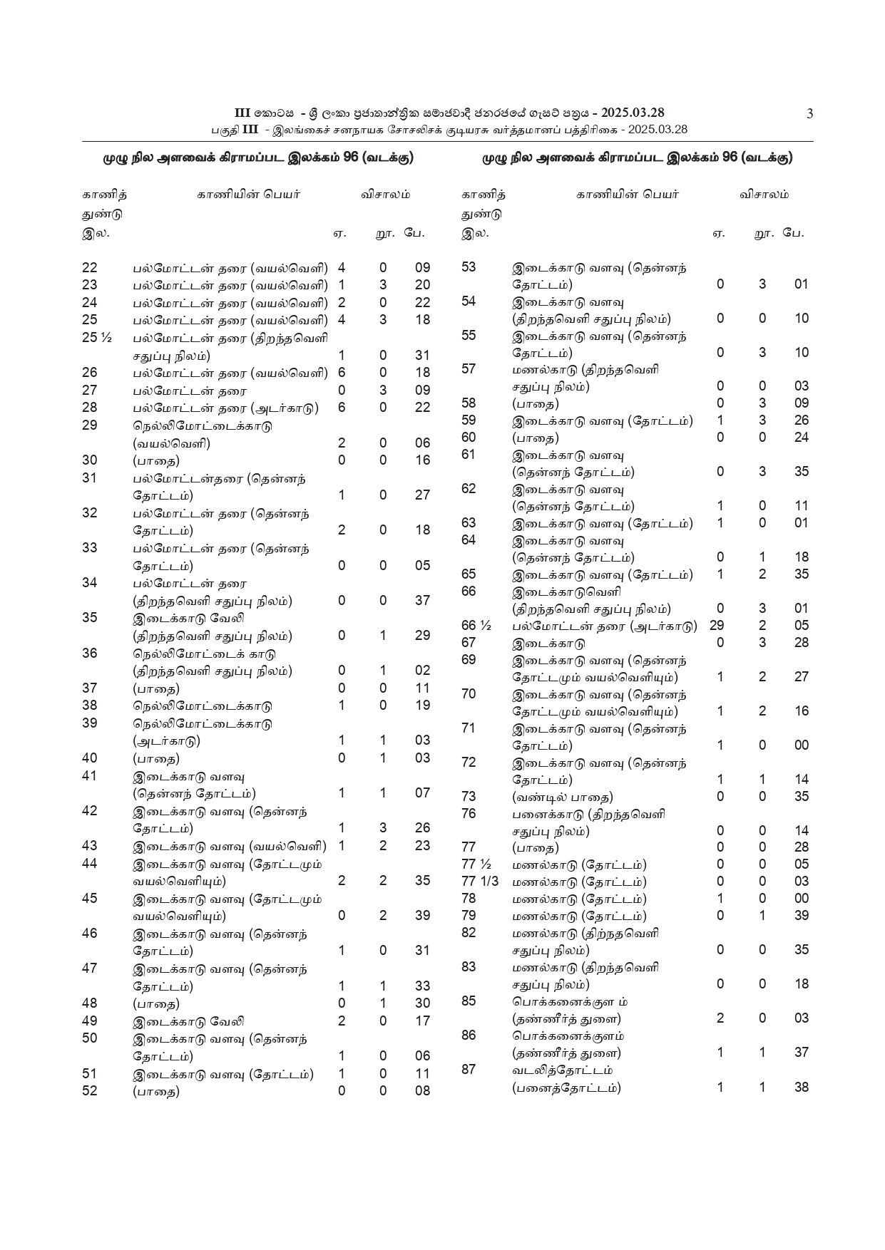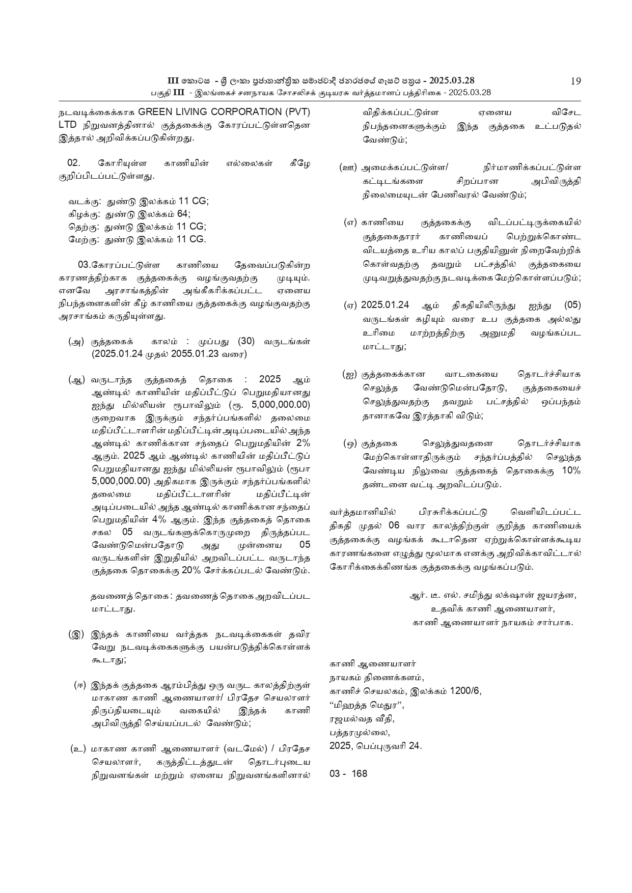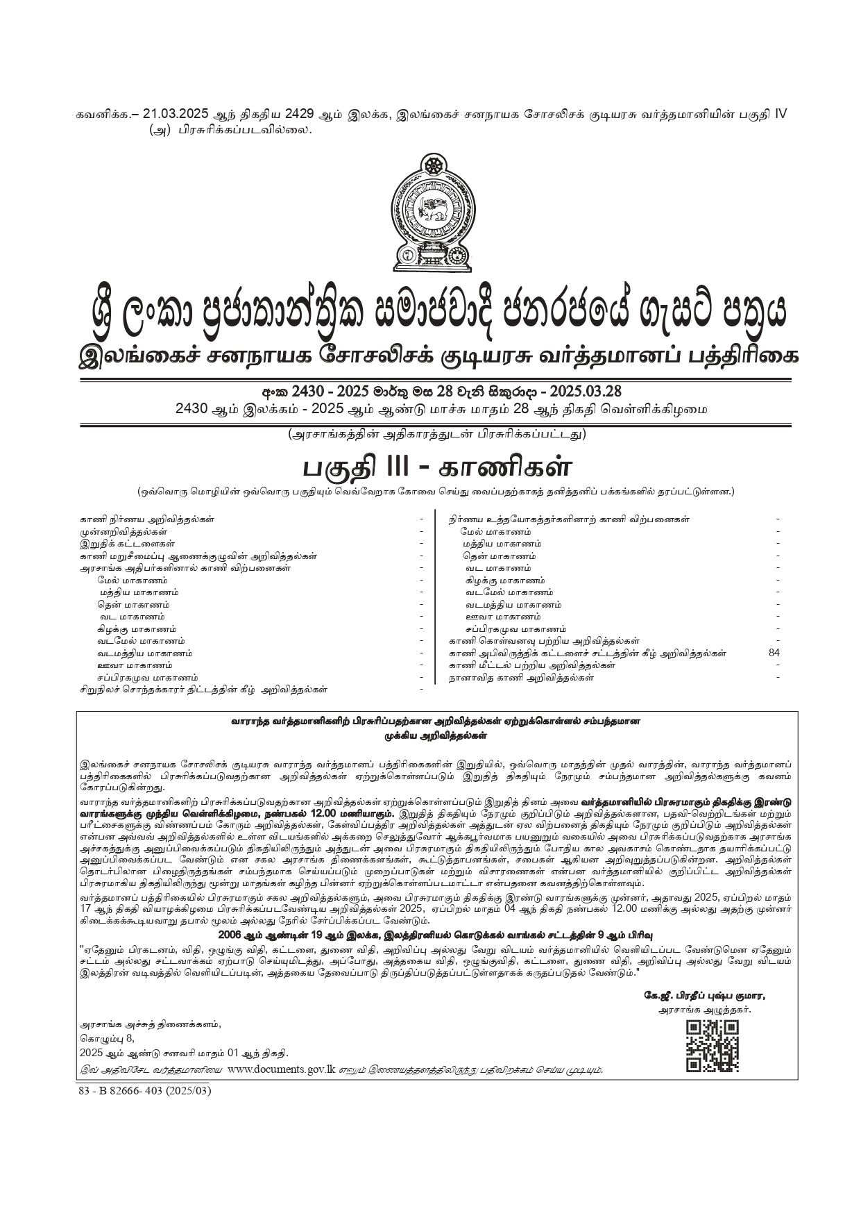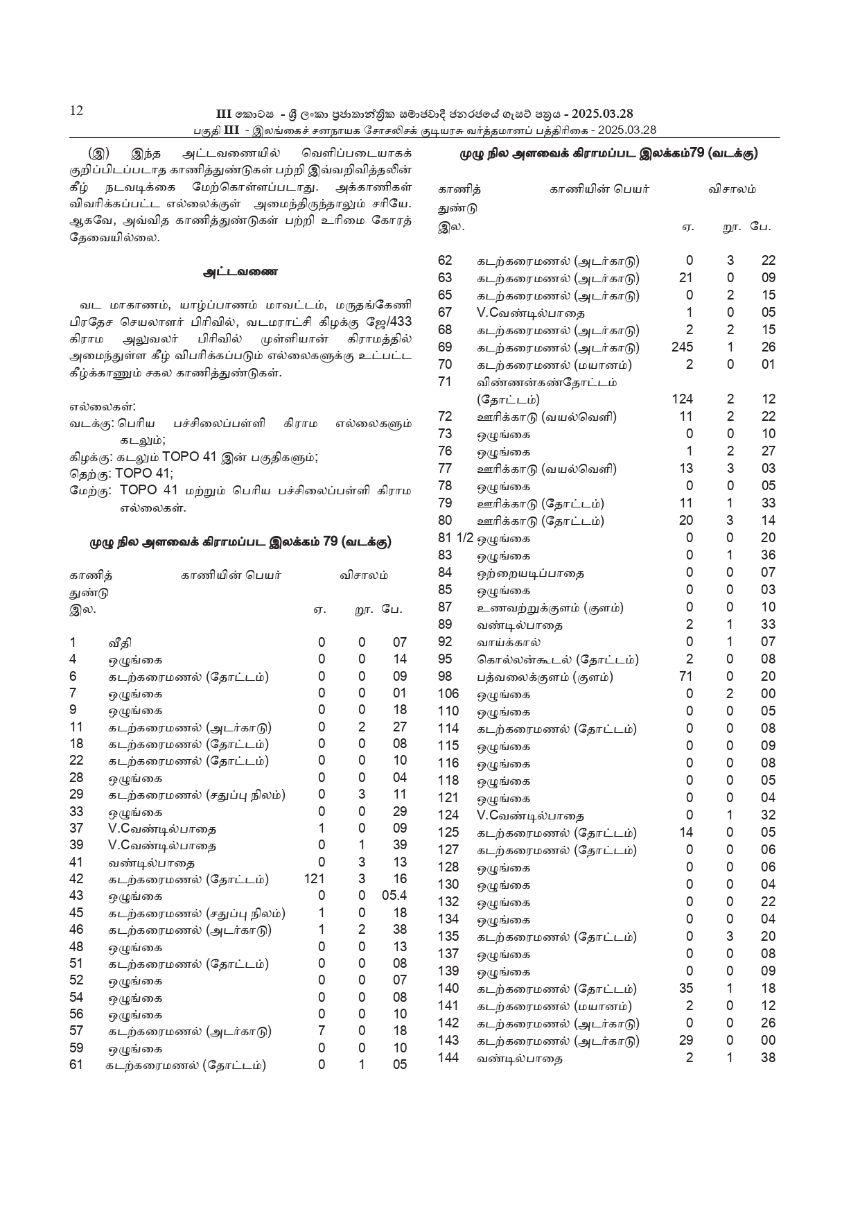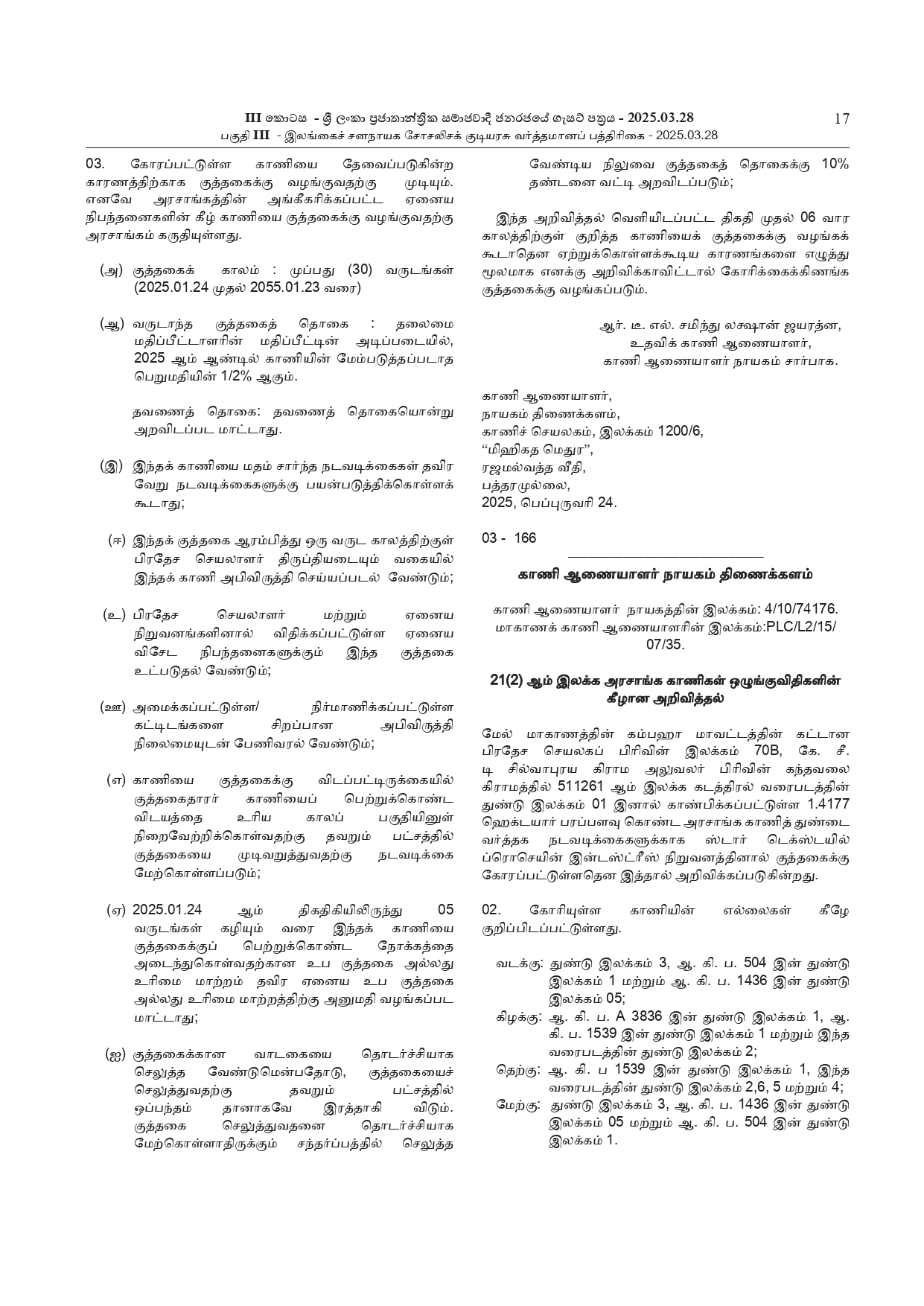 யாழ்ப்பாணம், கிளிநொச்சி, முல்லைத்தீவில் மொத்தமாக 5,940 ஏக்கர் காணிகள் 3 மாதங்களுக்குள் ஒருவரும் உரிமை கோராவிட்டால் அரச காணிகளாக பிரகடனப்படுத்தப்படும் என்று 28.03.2025 திகதியிட்ட 2430 இலக்கமிட்ட வர்த்தமானியில் காணி நிர்ணய கட்டளைச் சட்டத்தின் 4ஆம் பிரிவின் கீழ் பிரசுரமாகியுள்ளது.