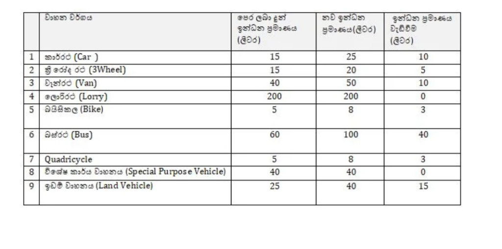 திருத்தப்பட்ட ஒதுக்கீட்டின்படி, கார்களுக்கான வாராந்திர எரிபொருள் ஒதுக்கீடு 15 லிட்டரிலிருந்து 25 லிட்டராகவும், மூன்று சக்கர வாகனங்களுக்கான ஒதுக்கீடு 15 லிட்டரிலிருந்து 20 லிட்டராகவும் அதிகரிக்கப்பட்டுள்ளது.